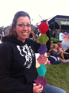 Og så løb jeg tør for garn til Annas One Night Knit montering… og da jeg fandt strikkepindene frem til mit nye års tæppe, faldt snakken på hjemmelavede strikkepinde og du fandt Robert selv- og velgjorte pinde frem. Så kunne jeg i ro og mag strikke en lap til dit tæppe. Den blev noget løs i det, men i det store og hele fik den den rette form.