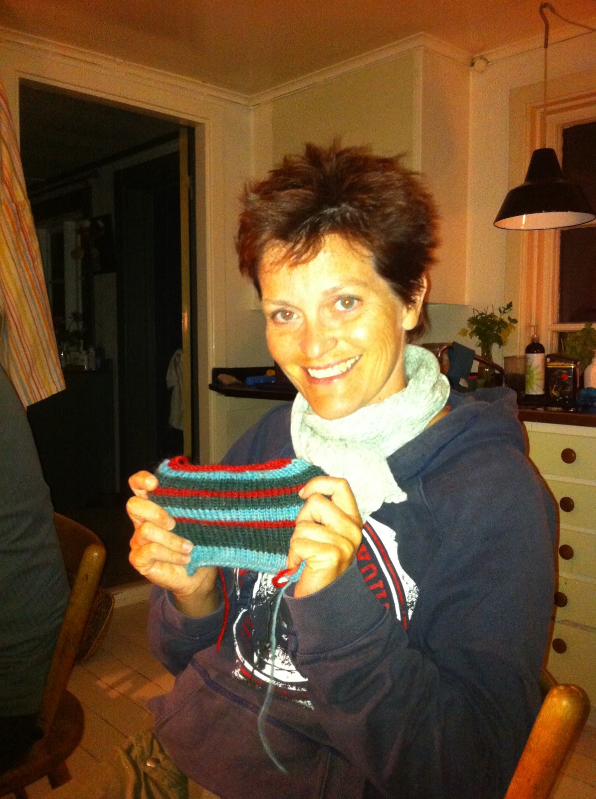 Her er det Susanne, der ellers ALDRIG strikker, der har fået lavet en lap. Og nu er det jo ikke for ingenting at jeg er håndarbejdslærer; Susanne fik strikket endnu en lap og denne gang med en lap med lidt avanceret indtagning.