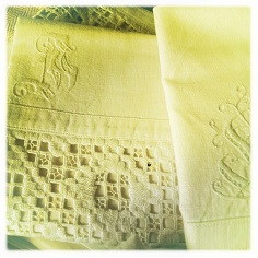 Der var også lige et par overlagner og et par pudebetræk med et meget fint og snørklet monogram og et mellemværk som er helt modsat firkantet.