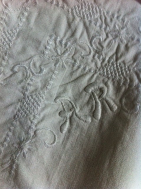 Da jeg var ved at tage strømper på julemorgen faldt mit blik på et pudebetræk med monogram. Så med et ben i strømpebukserne måtte jeg have taget billede, det er jo klart ![]()