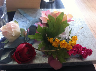 Jeg har en god samling bånd – denne gang blev det et blågråt grosgrain fra Handler (- uha den butik har mange skønne bånd…) og efterhånden også en del blomster. Dem syntes jeg til gengæld det er svært at få fat i – jeg vil nemlig have dem så livagtige som muligt. Nogen er fundet i Netto, i hobbybutikker eller på planteskolen, det er bare at holde øjnene åbne – og er der nu nogen der har et link til et godt sted, må I meget gerne dele det med mig.