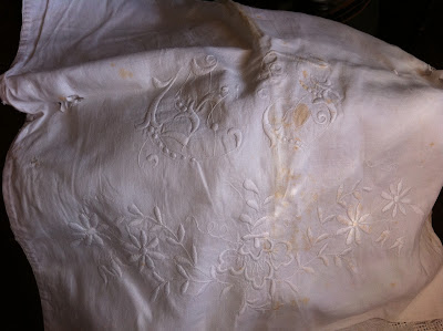 Blomster, blade og monogram, samt “la….kant” og huller. Alt håndsyet.